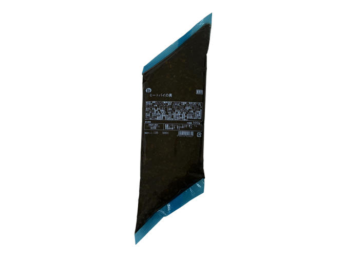 - 冷却後上下にカットし、レタス6g、ハンバーグ100g、スライストマト20g、ミートパイの具20g、パルメザンチーズソース35gの順にサンドします。