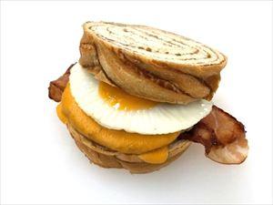 スイーツメープルシートNを折込んだラウンド食パンをスライスして、バーガーにしました。ベーコン、パティ、チェダーチーズ、目玉焼きを 挟んだ具沢山の甘じょっぱいバーガーです。